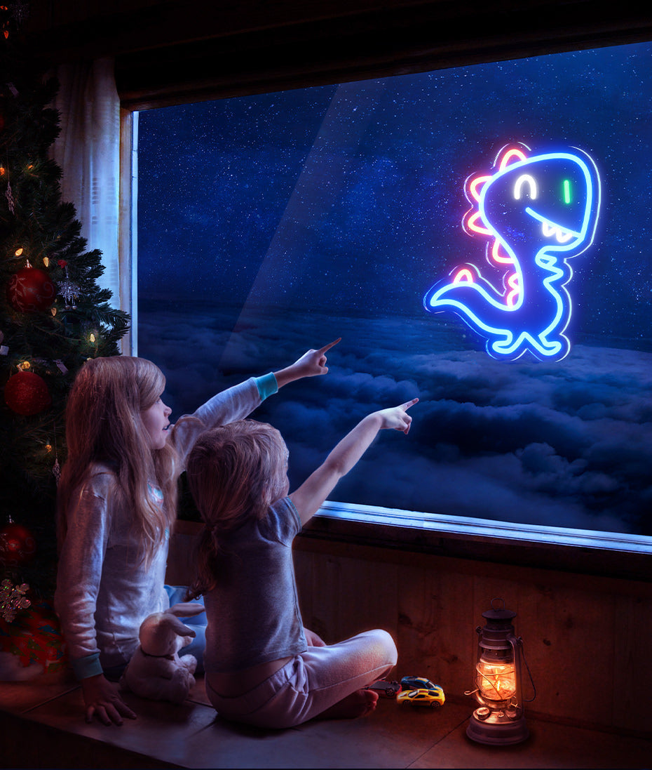 Lys opp barnerommet med vår Blå neon LED-lampe med dinosaurmotiv
