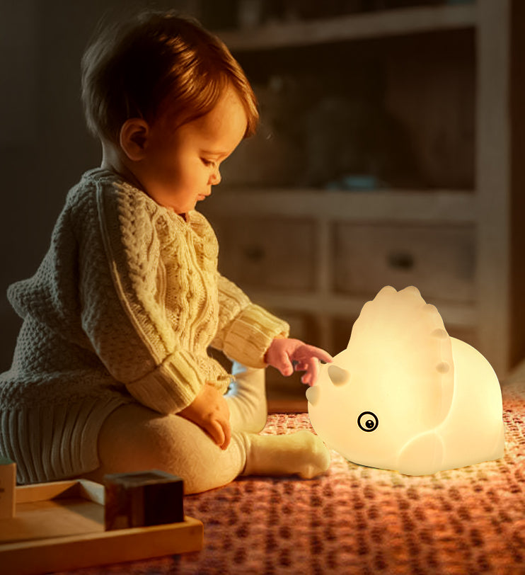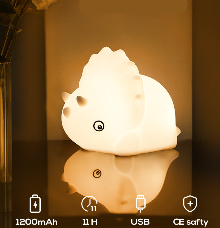 Gi barnerommet en magisk glød med vår sjarmerende dinosaur nattlampe i silikon med touch! Denne nattlampen er ikke bare en praktisk lyskilde, men også en morsom og trygg følgesvenn for barnet ditt gjennom natten. Med sitt vennlige triceratops-design og myke, varme lys, skaper den en beroligende atmosfære som hjelper de små med å finne roen før sengetid. Den er laget av høykvalitets, babyvennlig silikon, noe som gjør den utrolig myk å ta på og helt trygg å leke med. Si farvel til mørkredde netter og hei til søte drømmer med denne herlige dinosaur nattlampen!