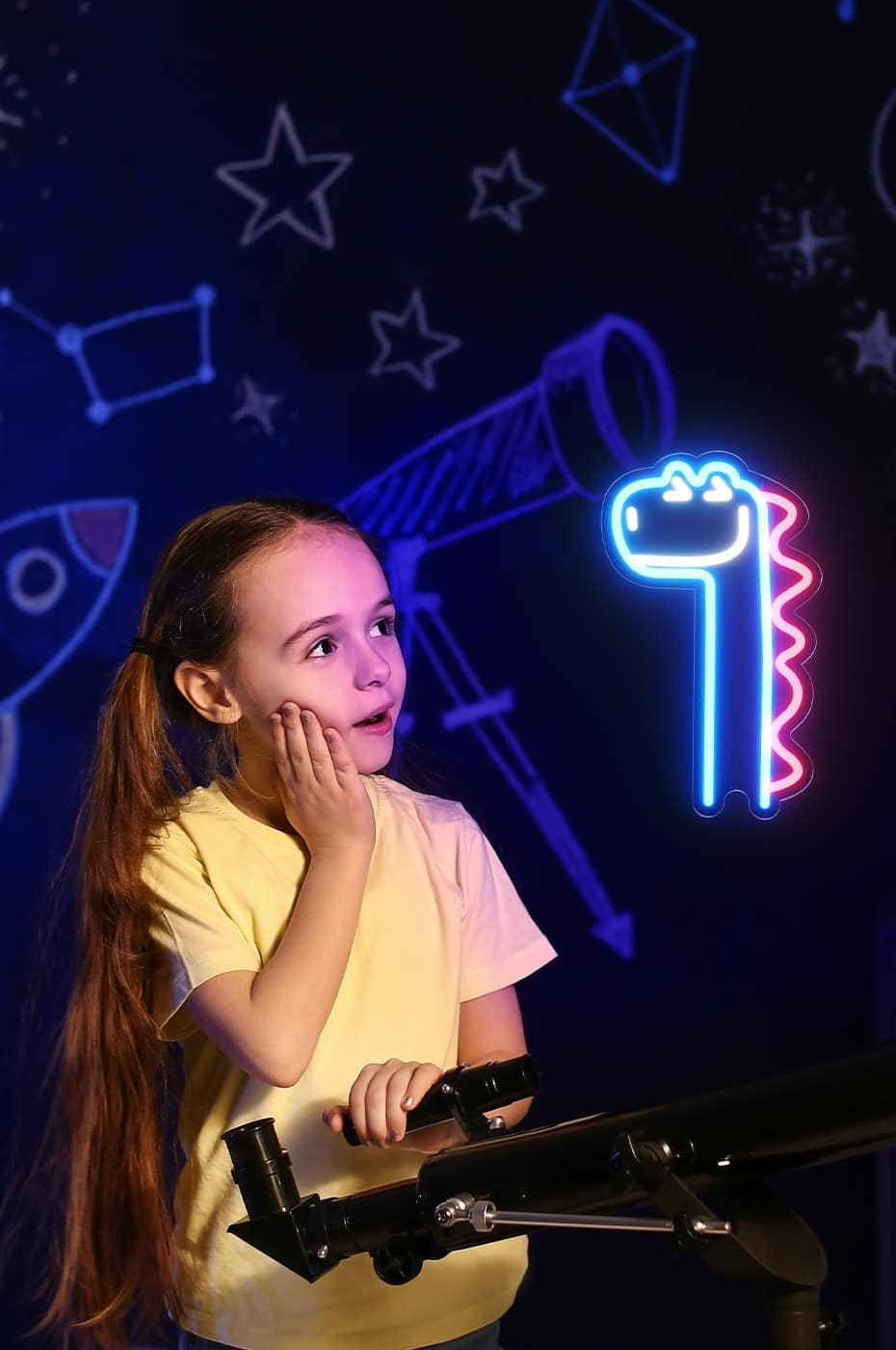 Forvandl ethvert rum til en fortryllende oase med vores unikke LED neonlys, der forestiller en sød langhals dinosaur. Dette charmerende neonskilt er designet til at bringe et smil frem hos både børn og voksne, og med sine bløde, lysende konturer skaber det en hyggelig og legende atmosfære. Forestil dig din stue, børneværelset eller endda dit kontor bade i det blide, blå og rosa skær fra denne venlige forhistoriske ven. Det er mere end bare belysning; det er et kunstværk, der tilføjer personlighed og et strejf af vidunder til din indretning. Skabt med holdbar LED-teknologi, får du ikke kun et smukt design, men også en langvarig og energieffektiv løsning, der vil lyse op i dit hjem i mange år fremover.